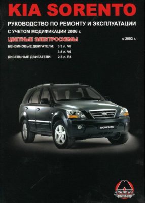 Руководство по ремонту Kia Sorento с 2003, а также руководство по эксплуатации и техническому обслуживанию, устройство автомобилей Kia Sorento с 2003 г. выпуска, с учетом модификации 2006 г. выпуска, оборудованных бензиновыми двигателями рабочим объемом 3,3, 3,8 л. и дизельными двигателями рабочим объемом 2,5 л.