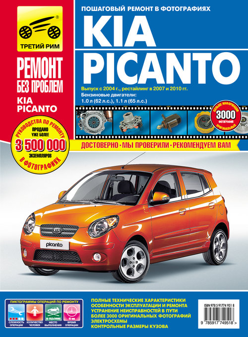 Иллюстрированное в цвете справочно-информационное пособие Руководство по ремонту Киа Пиканто, руководство по эксплуатации и техническому обслуживанию, устройство Kia Picanto с 2004 г. выпуска, оборудованных бензиновыми двигателями G4HG рабочим объемом 1,1 л. Цветные фотографии. Ремонт Киа Пиканто. Инструкция по эксплуатации. Электросхемы. Устройство автомобиля.