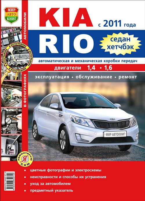 Цветная, в фотографиях, практическая книга по ремонту Kia Rio, инструкция по эксплуатации, техническое обслуживание, устройство автомобилей Киа Рио с 2011 года выпуска, в кузовах седан и хетчбэк, оборудованных автоматическими и механическими коробками передач и бензиновыми двигателями рабочим объемом 1,4, 1,6 л. Пошаговый ремонт узлов и агрегатов Киа Рио.
