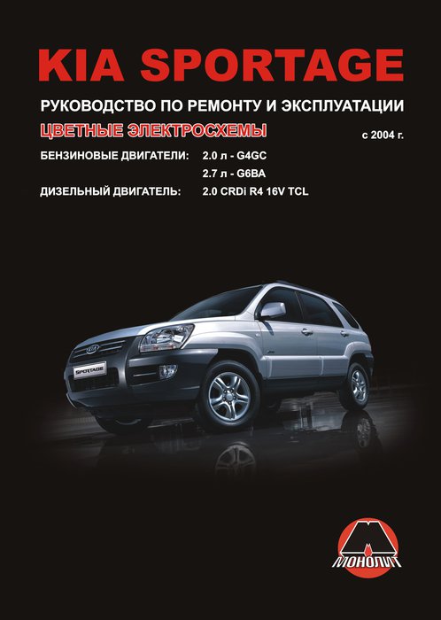Справочное пособие Руководство по ремонту Kia Sportage, а также руководство по эксплуатации и техническому обслуживанию, устройство автомобилей Kia Sportage c 2004 г. выпуска, оборудованных бензиновыми двигателями G4GC / G6BA рабочим объемом 2,0, 2,7 л., а также дизельными двигателями D4EA рабочим объемом 2,0 л.