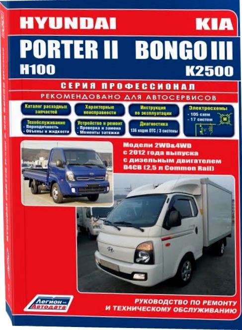 Профессиональное техническое руководство по ремонту Kia Bongo 3 / K2500, Hyundai Porter II / H100, каталог запасных частей, пособие по техническому обслуживанию и эксплуатации автомобилей Киа Бонго 3 / К2500, Хендай Портер 2 / Н100 с 2012 года выпуска. Модели 2WD&4WD, оборудованные дизельными двигателями D4CB (2,5 л Common Rail). Ремонт Киа Бонго 3. Каталог расходных запчастей. Рекомендации по эксплуатации и ТО. Устройство, диагностика, электрические схемы.