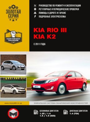 Справочное иллюстрированное издание руководство по ремонту Kia K2 / Kia Rio 3, устройство Kia K2 / Kia Rio 3, руководство по эксплуатации и техническому обслуживанию Kia K2 / Kia Rio 3, которые выпускаются с 2011 года и оборудуются бензиновыми моторами литражом 1,25, 1,4, 1,6, а также дизелями литражом 1,4 и 1,6.
