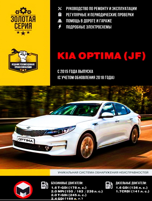 Инструкция по ремонту Киа Оптима, руководство по обслуживанию и эксплутации Kia Optima (JF) с 2015 (рестайлинг 2018 г. в пособии отображен), оборудованных бензиновыми двигателями рабочим объемом 1.6, 2.0, 2.4 литра мощностью 150, 163, 178, 188, 238, 245 л.с., а также дизельными двигателями рабочим объемом 1,6, 1,7 литра, мощностью 136, 141 л.с. Книга описывает автомобили как с механической, так и с автоматической коробкой передач.