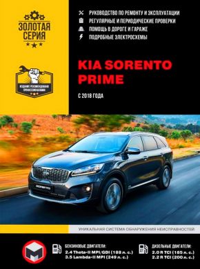 Руководство по ремонту Киа Соренто Прайм, книга по ремонту и эксплуатации KIA Sorento Prime с 2018 г. выпуска, оборудованных бензиновыми двигателями Theta-II MPI/ GDI, Lambda-II MPI объемом 2,4, 3,5 литра, мощностью 188, 249 л.с., а также дизельными двигателями R TCI объемом 2,0 2.2 литра, мощностью 185, 200 л.с. Ремонт KIA Sorento Prime (двигатель, коробка передач, кузов, тормоза, рулевое управление, другие узлы и агрегаты). Регулярные и переодические проверки. Эксплуатация и ТО. Помощь в дороге и гараже. Электросхемы. Уникальная система обнаружения неисправностей Киа Соренто Прайм.