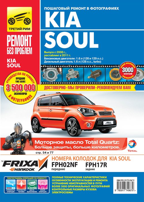 Руководство по ремонту Kia Soul, а также инструкция по эксплуатации и техническому обслуживанию, устройство Киа Соул с 2008 г выпуска (включая рестайлинг 2011 г), оборудованных бензиновыми двигателями рабочим объемом 1,6 л и дизельными двигателями объемом 1,6 л. Пошаговый ремонт Киа Соул. Цветные фотографии. Схемы электрооборудования.