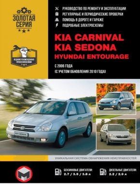 Иллюстрированное подробнейшее справочное издание книга по ремонту Kia Carnival / Kia Sedona, Hyundai Entourage, устройство Kia Carnival / Kia Sedona, Hyundai Entourage, руководство по эксплуатации и подробный подбор данных по техническому обслуживанию Kia Carnival / Kia Sedona, Hyundai Entourage. Модели с 2006 и с 2010 годов выпуска. Оснащаются Киа Карнивал, Киа Седона, Хендай Антураж моторами на бензине литражом 2,7, 3,5, 3,8 и дизелями литражом 2,2 и 2,9. Мощность движков 160, 185, 189 и 245 л.с. Ремонт узлов и агрегатов. Эксплуатация и ТО. Электросхемы.