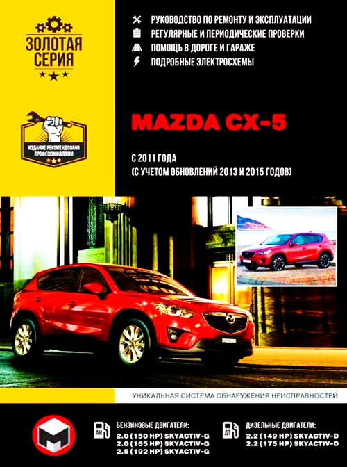 Профессиональное иллюстрированное руководство по ремонту Mazda CX-5, а также инструкция по эксплуатации и техническому обслуживанию, устройство Мазда СХ5 с 2011 года выпуска (с обновлениями 2013 года). Автомобили оборудованы бензиновыми двигателями рабочим объемом 2,0 л. (150 HP) SKYACTIV-G / 2.0 (165 HP) SKYACTIV-G, 2,5 л. (192 HP) SKYACTIV-G и дизельными двигателями рабочим объемом 2,2 л. (149 HP) SKYACTIV-D / 2.2 л. (175 HP) SKYACTIV-D. Ремонт узлов и агрегатов. Инструкция по эксплуатации. Электрические схемы Мазда СХ5. Система определения неисправностей