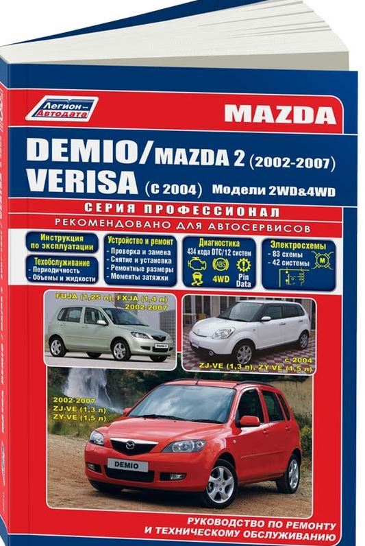 Иллюстрированное справочное пособие Руководство по ремонту Mazda 2, а также руководство по эксплуатации и техническому обслуживанию, устройство переднеприводных и полноприводных автомобилей Mazda Demio 2002-2007 гг. выпуска, Mazda Verisa с 2004 г. выпуска, оборудованных бензиновыми двигателями ZJ-VE (1,3 л), ZY-VE (1,5 л), а также переднеприводных Mazda 2 2002-2007 гг. выпуска, оснащенных бензиновыми двигателями FUJA (1,25 л), FXJA (1,4 л). Ремонт Мазда 2. Инструкция по эксплуатации. Рекомендации по ТО. Диагностика. Устройство автомобиля. Схемы электрических соединений.