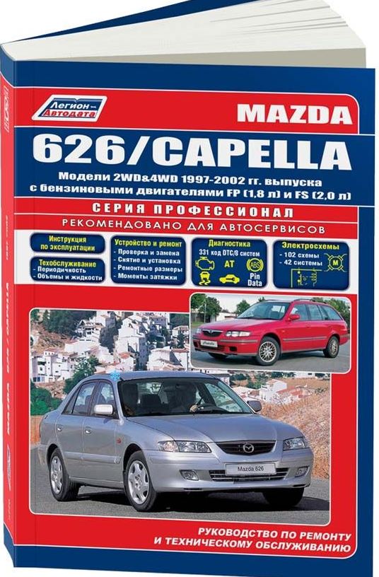 Руководство по ремонту, техническому обслуживанию и эксплуатации, устройство Mazda 626 / Capella 1997-2002 гг. выпуска, оборудованных бензиновыми двигателями FP и FS рабочим объемом 2,0 л. Ремонт Мазда-626. Инструкция по ТО и эксплуатации. Устройство автомобиля. Диагностика неисправностей. Электрические схемы.
