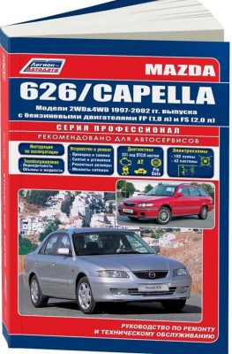Справочно-информационное издание Руководство по ремонту Mazda Capella / Mazda 626, техническому обслуживанию и эксплуатации, устройство Mazda Capella / Mazda 626 1997-2002 гг. выпуска, оборудованных бензиновыми двигателями FP и FS рабочим объемом 2,0 л. Ремонт Мазда Капелла. ТО, эксплуатация, устройство, диагностика, неисправности, электрические схемы.