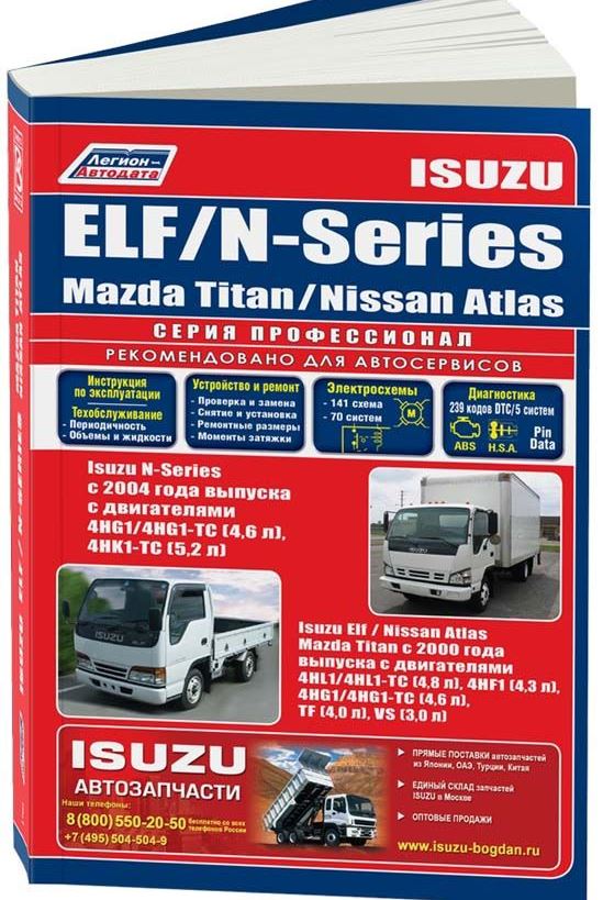 Предлагаемый подробнейший ремонтный мануал окажет посильную помощь всем оказавшимся в непростой ситуации пользователям Мазда Титан, Исудзу Эльф, Исудзу N-серии или Ниссан Атлас, механикам ремонтных мастерских и автоцентров, сотрудникам дорожных СТО, а также всем прочим профессионалам, осуществляющим процедуры ремонта и обслуживания техники такого класса. Также книга рекомендована всем владельцам и руководителям автосервисов, которые видят одной из своих задач повышение квалификации сотрудников.