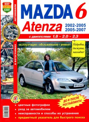 Иллюстрированное в цвете информационное справочное издание Пособие по ремонту Мазда 6, Мазда Атенза, а также устройство, руководство по эксплуатации и техническому обслуживанию автомобилей Мазда 6, Мазда Атенза производство которых осуществлялось с 2002 по 2005 года, а также рестайлинговые модели 2005-2007 годов выпуска, и которые оборудовались бензиновыми двигателями рабочим объемом 1,8, 2,0, 2,3 л. Ремонт Мазда 6. Инструкция по эксплуатации. Рекомендации по ТО. Схемы электрооборудования.