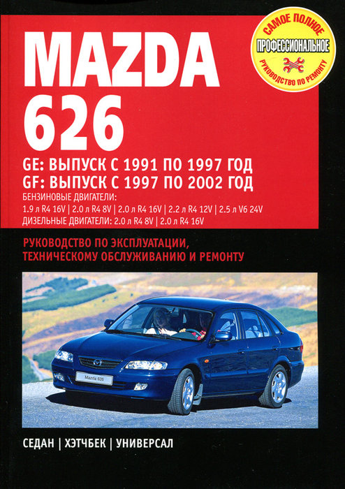 Справочное иллюстрированное издание Пособие по обслуживанию Мазда 626, устройство, руководство по эксплуатации и проведению ремонтных операций Mazda 626 четвертого (1991-1997, тип GE) и пятого (1997-2002, тип GF) поколений, в кузове хетчбек, седан или универсал с передним или полным приводом 4WD. На эти модели устанавливались бензиновые двигатели рабочим объемом 1,9, 2,0, 2,2, 2,5 л., а также дизели рабочим объемом 2,0 л. и оснащались они 5-ти ступенчатой МКП или 4-х ступенчатой АКП.