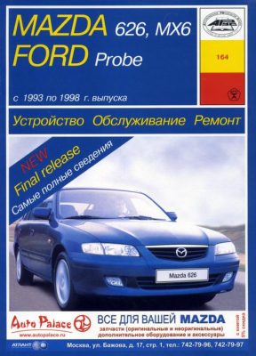 Справочное издание Руководство по ремонту Mazda MX-6, Mazda 626 и Ford Probe , а также руководство по эксплуатации и техническому обслуживанию, устройство автомобилей Mazda MX-6, Mazda 626 и Ford Probe 1993-1998 гг. выпуска, с кузовами Седан, Хэтчбек и Купе, оборудованных рядными 4-цилиндровыми и V6 бензиновыми двигателями рабочим объемом 2,0 и 2,5 л., оснащенных 5-ступенчатой РКПП, либо 4-ступенчатой АТ.