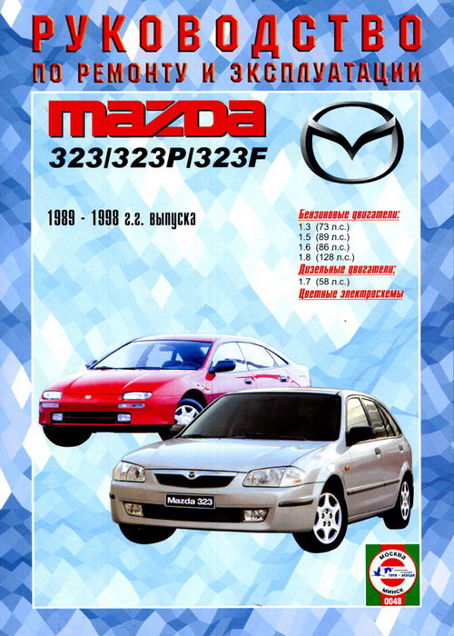 Руководство по ремонту и эксплуатации Mazda 323 оборудованных бензиновыми двигателями B3 1,3 л. / 54 кВт (73 л.с.) карбюратор, B5 1,5 л. / 65 кВт (89 л.с.) инжектор, B6 1,6 л. / 63 кВт (86 л.с.) инжектор, BP 1,8 л. / 94 кВт (128 л.с.) инжектор и дизельными двигателями PN 1,7 л. / 41 кВт (58 л.с.). Модель 1989-1998 гг. выпуска. Ремонт узлов и агрегатов Мазда 323. Эксплуатация, техобслуживание, электрические схемы.