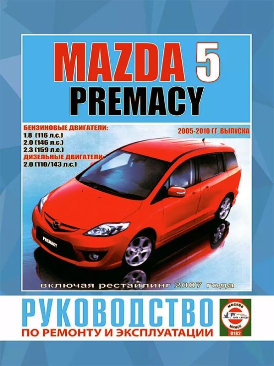 Книга (мануал) по ремонту и эксплуатации Мазда 5 / Премаси (кузов CR) второго поколения. В электронной книге рассмотрены автомобили 2005 – 2010 года выпуска с бензиновыми и дизельными двигателями. Отлично подойдет тем, кто желает ознакомится с устройством и провести самостоятельный ремонт технических узлов и агрегатов японского автомобиля.