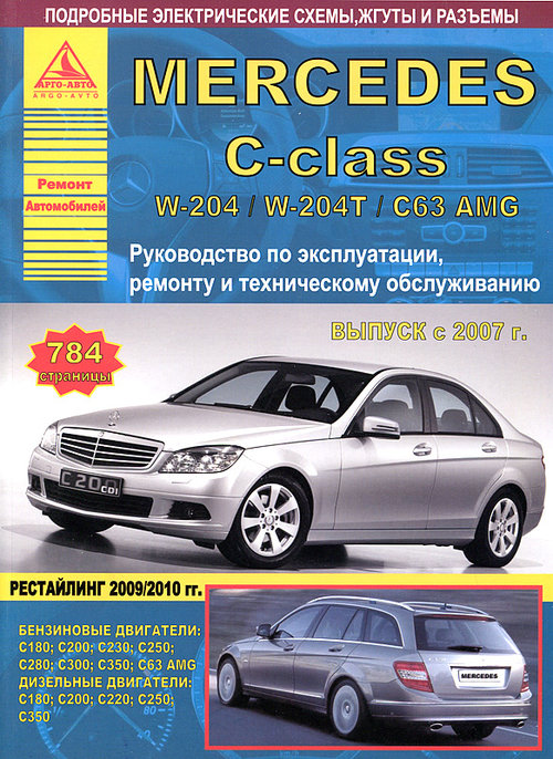 Подробнейшее справочное иллюстрированное издание Инструкция по ремонту Mercedes C-класса, устройство, руководство по эксплуатации и техническому обслуживанию Mercedes C класса с кузовами W204, W204T, C63 AMG, которые выпускаются с 2007 года (включая рестайлинг 2009/2010) и оборудуются бензиновыми двигателями рабочим объемом 1,8, 2,5, 3,0, 3,5, 6,2 л., а также дизелями литражом 2,1 и 3,0. Ремонт Мерседес 204. Инструкция по эксплуатации. Рекомендации по обслуживанию. Схемы электрических соединений.