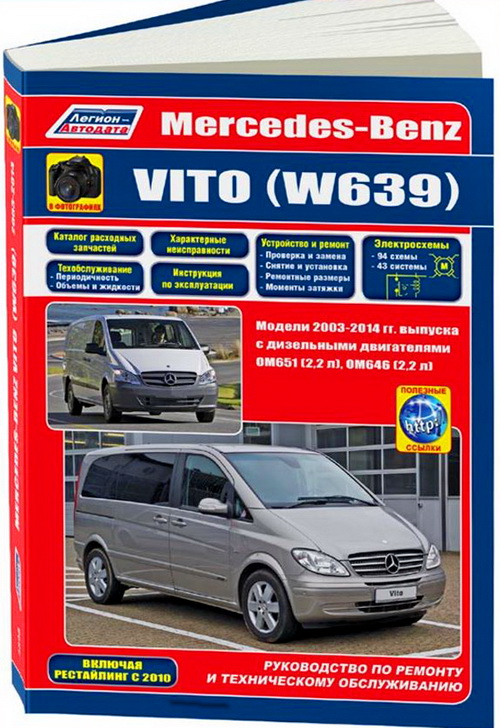 Руководство по ремонту Мерседес Вито, инструкция по эксплуатации и техническому обслуживанию Mercedes-Benz Vito 2003-2014 г. выпуска, включая рестайлинг 2010 года, оборудованных дизельными двигателями OM651 и OM646 рабочим объемом 2,2 литра. Ремонт узлов и агрегатов. Перечень неисправностей, рекомендации по ТО, электросхемы. Устройство. Каталог расходных запчастей.