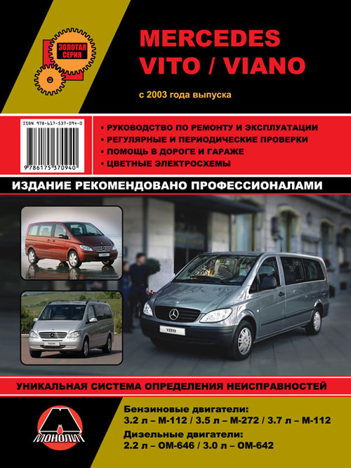Справочное иллюстрированное издание книга по ремонту Мерседес Виано, Мерседес Вито, устройство, руководство по эксплуатации и техническому обслуживанию Mercedes Viano / Mercedes Vito, которые выпускаются с 2003 года и оборудованы бензиновыми двигателями литражом 3,2, 3,5, 3,7, а также дизелями литражом 2,2 и 3,0. Типы силовых агрегатов: M-112 / M-272 / OM-646 / OM-642. Мощность: 107 / 148 / 190 / 204 / 218 / 231 / 258 л.с. Ремонт узлов и агрегатов Мерседес Виано. ТО. Эксплуатация. Система определения неисправностей. Схемы электрических соединений.