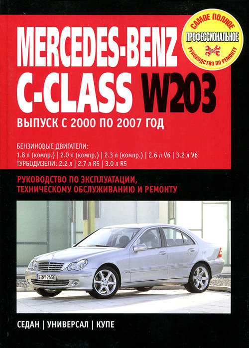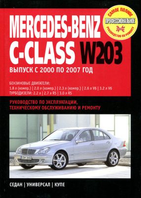 Справочное иллюстрированное издание Пособие по ремонту Мерседес C класса, устройство, руководство по эксплуатации и техническому обслуживанию Mercedes Benz С-Class W203 в кузове седан, купе второго поколения и универсал, которые выпускались с 2000 по 2007 год. Оснащались модели 4-х цилиндровыми рядными с компрессором бензиновыми двигателями литражом 1,8 (С180К), 2,0 (С200К), 2,3 (С230К), 6-ти цилиндровыми V-образными литражом 2,6 (С240), 3,2 (С320 и С32 AMG), а также 4-х цилиндровым рядным турбодизелем CDI с непосредственным впрыском литражом 2,2 (С200 CDI, C220 CDI), 5-ти цилиндровыми рядными турбодизелями литражом 2,7 (С270 CDI), 3,0 (СЗО CDI AMG). Оборудовались машины 5-ти и 6-ти ступенчатой МКП или 5-ти ступенчатой АКП.
