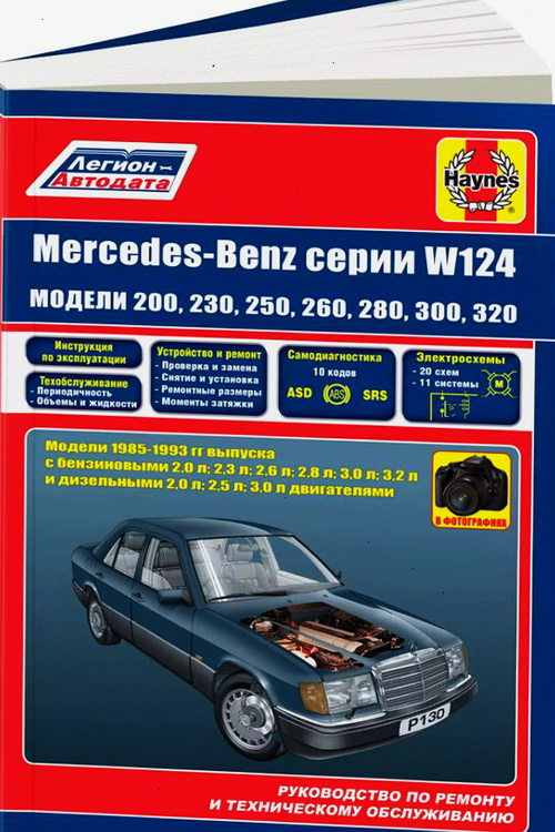 Руководство по ремонту Мерседес 124, книга по ремонту, инструкция по эксплуатации и обслуживанию Mercedes E класса, 1985-1993 г. выпуска, оборудованных бензиновыми двигателями рабочим объемом 2,0, 2,3, 2,6, 2,8, 3,0, 3,2 литра, а также дизельными двигателями рабочим объемом 2,0, 2,5, 3,0 литра.