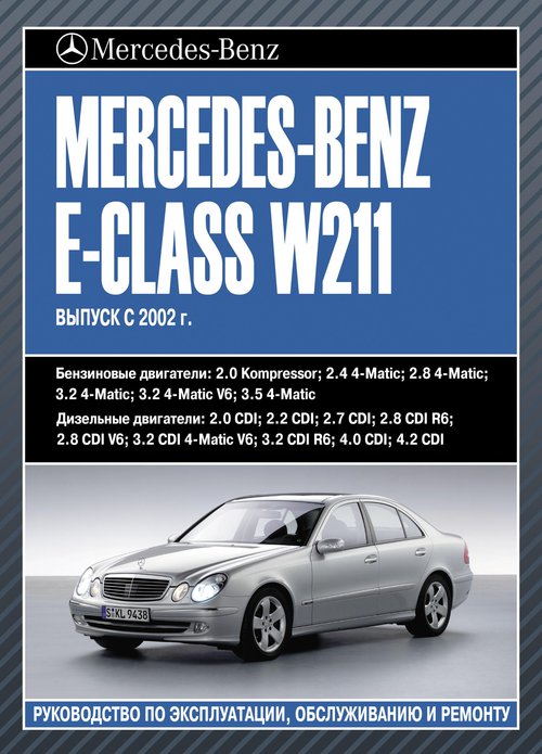 Иллюстрированное справочно-информационное издание руководство по ремонту Mercedes E-класса (кузов W211), а также руководство по эксплуатации и техническому обслуживанию, устройство Mercedes Benz E-класса, выпускаемых с марта 2002 г. (седан) и с марта 2003 г. (универсал), оснащенных бензиновыми моторами объемом 2,0 л. (Kompressor), 2,4 л. (4-Matic), 2,8 л. (4-Matic), 3,2 л. (4-Matic), 3,2 л. (4-Matic V6), а также турбодизельными моторами объемом 2,0 л. (CDI), 2,2 л. (CDI), 2,7 л. (CDI), 2,8 л. (CDI R6), 2,8 л (CDI V6), 3,5 л. (4-Matic). На машины установлены либо АКПП либо МКПП.