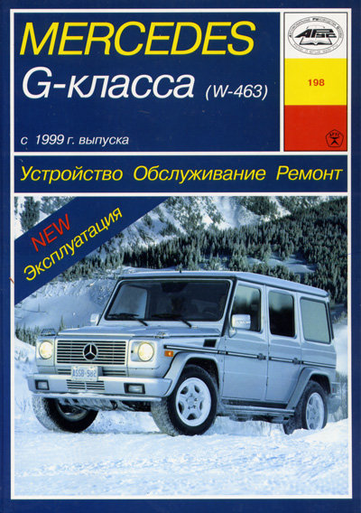 Справочно-информационное издание Руководство по ремонту Mercedes Benz G класса, а также руководство по техническому обслуживанию и эксплуатации, устройство автомобилей Mercedes Benz G класса (W 463) с 1999 г. выпуска. В книге рассматриваются модели G320, G500, G55AMG, G270CD, G400CDI с бензиновыми 6-цилиндровыми и 8-цилиндровыми и турбированными дизельными 5- и 8-цилиндровыми двигателями, оборудованные 5-ступенчатой автоматической трансмиссией.