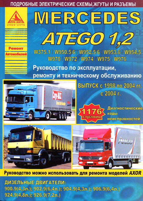 Подробнейшее иллюстрированное информационно-справочное издание руководство по ремонту Mercedes Atego 1, 2, руководство по техническому обслуживанию и эксплуатации Mercedes Atego 1, 2, устройство Mercedes Atego 1 1998-2004 гг. выпуска, Mercedes Atego 2 с 2004 г. выпуска (рассмотрены модели W375.1 / W950.5/6 / W952.5/6 / W953.6 / W954.5 / W970 / W972 / W974 / W975 / W976), оснащенных дизельными агрегатами 900.9, 904.9 (рабочим объемом 4,3 л.), 924.9 (4,8 л.), 902.9, 906.9 (6,4 л.), 926.9 (7,2 л.). Эту книгу можно использовать и в качестве руководства по ремонту Mercedes Axor. Ремонт Мерседес Атего. Подробнеейшее справочное пособие. Эксплуатация. ТО. Электросхемы.