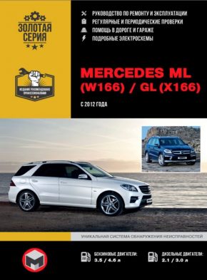 Профессиональное иллюстрированное руководство по ремонту Mercedes GL класса (W166), инструкция по эксплуатации, техническое обслуживанию, устройство автомобилей Мерседес ГЛ класса с 2012 года выпуска, оборудованных бензиновыми двигателями рабочим объемом 3,5, 4,6 л и дизельными двигателями объемом 2,1, 3,0 л.