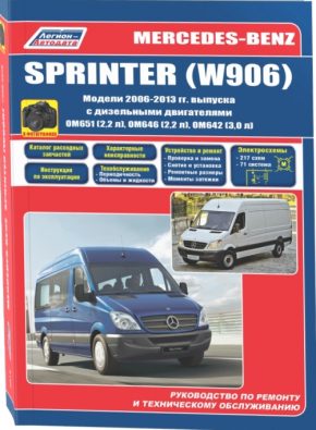 Профессиональный иллюстрированный фотографиями технический справочник Книга по ремонту Mercedes-Benz Sprinter (W906), каталог расходных запасных частей, а также пособие по эксплуатации и техническому обслуживанию автомобилей Мерседес Спринтер (В906) с 2006 по 2013 гг. выпуска. Модели оборудовались дизельными двигателями OM651.955 / 956 / 957 (2,2 л Common Rail), OM646.984 / 985 / 986 / 989 / 990 (2,2 л Common Rail), OM642.896 / 992 (3,0 л Common Rail). Ремонт узлов и агрегатов Мерседес Спринтер. Рекомендации по эксплуатации и ТО. Каталог расходных запчастей. Диагностика. Неисправности. Схемы электрических соединений.