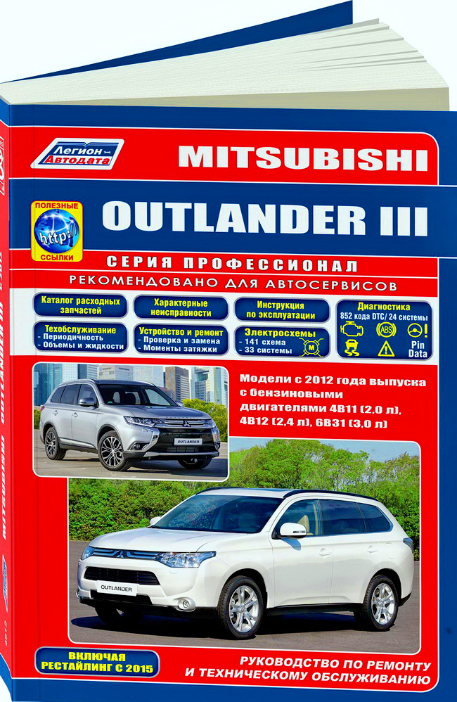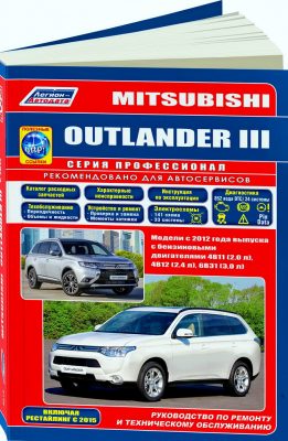 Книга по ремонту Mitsubishi Outlander III, руководство по ремонту Мицубиси Оутлендер 3, инструкция по эксплуатации Мицубиси Аутлендер 3, с 2012 г. выпуска, оборудованных бензиновыми двигателями 4B11рабочим объемом 2,0 литра, 4B12 рабочим объемом 2,4 литра, 6B31 рабочим объемом 3,0 литра.
