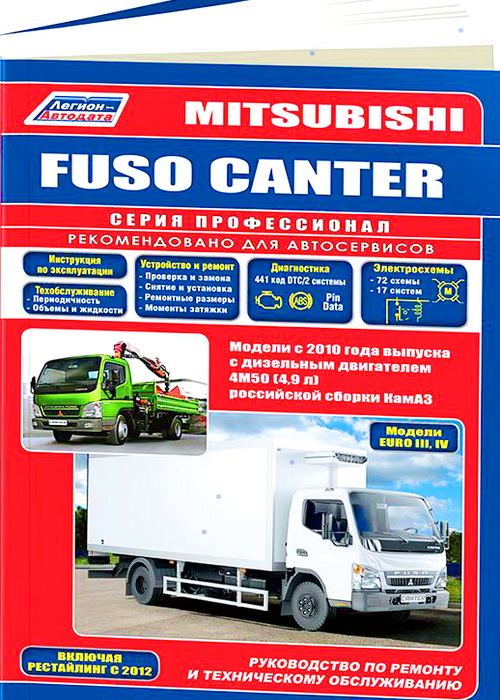 Инструкция по ремонту Mitsubishi Fuso Canter с 2010 г. выпуска, руководство по ремонту и эксплуатации Мицубиси Фусо Кантер, оборудованных дизельными двигателями рабочим объемом 4,9 литра.