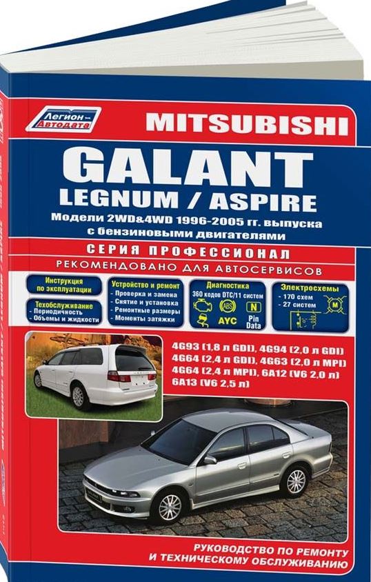 Иллюстрированный справочно-информационный мануал Руководство по ремонту Mitsubishi Galant / Legnum / Aspire, а также руководство по техническому обслуживанию и эксплуатации, устройство автомобилей Mitsubishi Galant / Legnum / Aspire 1996-2003/2005 гг. выпуска с левосторонним и правосторонним рулевым управлением, оборудованных бензиновыми двигателями GDI 4G93 (1,8 л), 4G94 (2,0 л), 4G64 (2,4 л) и бензиновыми двигателями MPI 4G63 (2,0 л), 4G64 (2,4 л), 6А12 (V6 2,0 л) и 6А13 (V6 2,5 л). Ремонт Мицубиси Галант. Устрйоство. Техобслуживание. Эксплуатация. Диагностика. Схемы электрических соединений.