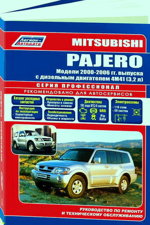 Справочно-информационное пособие книга по ремонту и эксплуатации Mitsubishi Pajero, а также руководство по техническому обслуживанию, устройство автомобилей Mitsubishi Pajero 2000-2006 гг. выпуска, оборудованных дизельным двигателем 4М41 рабочим объемом 3,2 л. Ремонт Мицубиси Паджеро. Каталог расходных запчастей. Рекомендации по ТО. Инструкция по эксплуатации. Устройство и диагностика. Схемы электрических соединений.