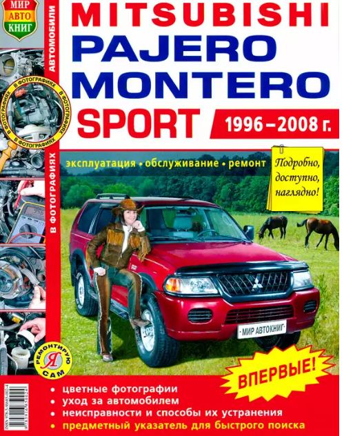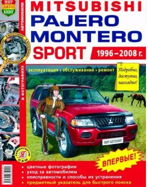 Справочно-информационное, с подробными цветными иллюстрациями пособие книга по ремонту Mitsubishi Pajero Sport / Montero Sport, а также руководство по устройству, руководство по эксплуатации и процедурам связанным с техобслуживанием машин Mitsubishi Pajero / Montero / Montero Sport / Pajero Sport. Эти автомобили выпускались с 1996 до 2008 года. Модели оснащены шестицилиндровыми бензиновыми двигателями 6G72 рабочим объемом 3,0 л. и 6G74 объемом 3,5 л. Подробный ремонт Мицубиси Паджеро. Цветные фотографии. Электросхемы.