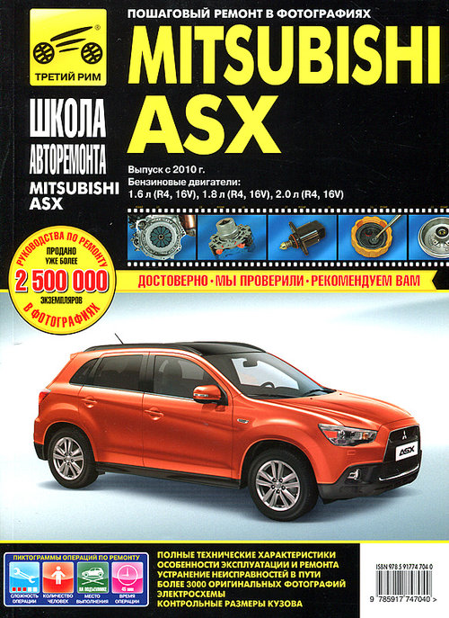 В отдельные разделы авторами мануала включены инструкция по эксплуатации Мицубиси АСХ, рекомендации по проведению регулярного техобслуживания и цветные схемы электрооборудования (электросхемы) Мицубиси АСХ. Кроме того материалы пособия помогут его владельцу подобрать нужные запчасти Мицубиси АСХ.