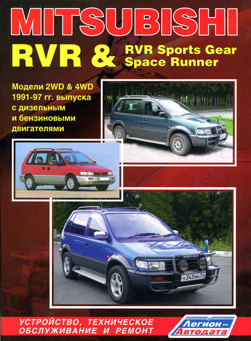 Справочно-информационное руководство книга по ремонту Мицубиси РВР, устройство Мицубиси РВР, руководство по техническому обслуживанию и эксплуатации Mitsubishi RVR / Mitsubishi RVR Sports Gear / Mitsubishi Space Runner 1991-1997 гг. выпуска, оборудованных бензиновыми моторами 4G63 (2,0 л.), 4G63 T/C (2,0 л. с турбонаддувом), 4G93 (1,8 л.) и дизельным двигателем 4D68 (2,0 л.).