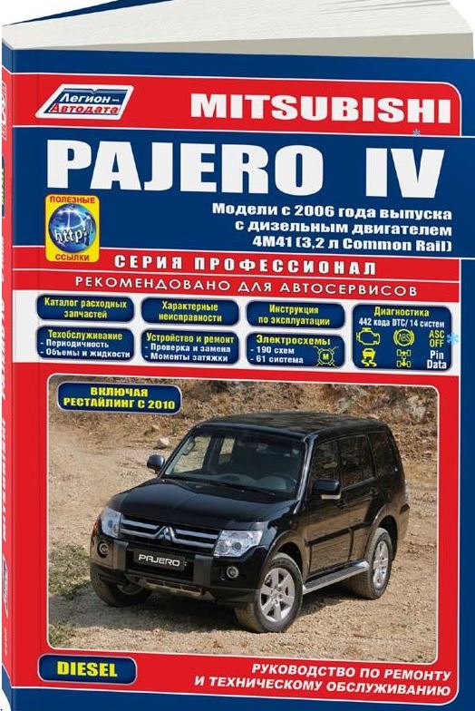 Иллюстрированная информационно-справочная инструкция по ремонту Мицубиси Паджеро-4, также рассмотрено устройство Mitsubishi Pajero-4, руководство по эксплуатации и техническое обслуживание Mitsubishi Pajero. Модель производится с 2006 года, в книге также описываются рестайлинговые модели с 2010 г. выпуска. Машина оборудована дизельным мотором 4M41 рабочим объемом 3,2 л. Ремонт узлов и агрегатов Мицубиси Паджеро4. Каталог расходных запчастей. Рекомендации по ТО и эксплуатации. Неисправности. Устройство автомобиля. Диагностика. Схемы электрических соединений.