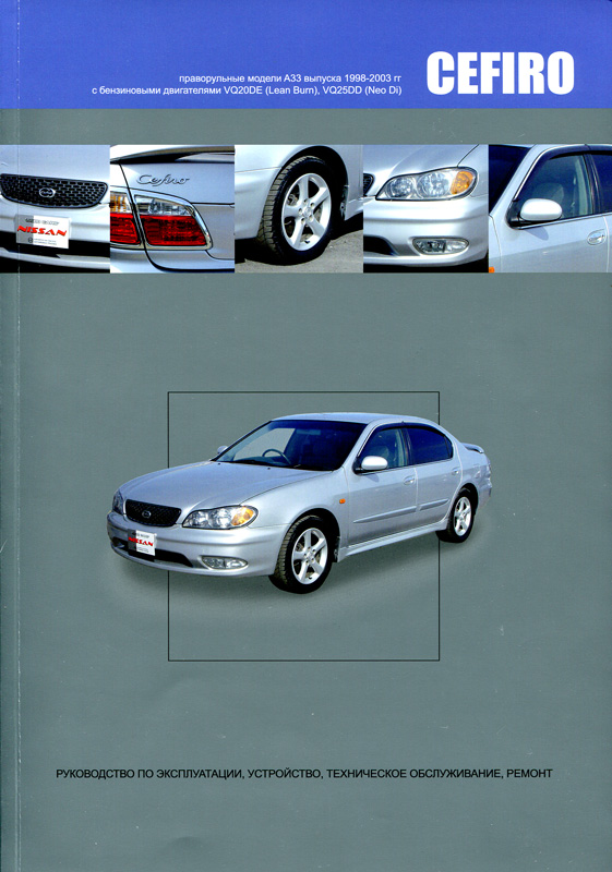 Справочно-информационное пособие Руководство по ремонту Nissan Cefiro A33, а также руководство по эксплуатации и техническому обслуживанию, устройство праворульных автомобилей Nissan Cefiro модели A33 1998-2003 гг. выпуска, оборудованных бензиновыми двигателями VQ20DE (L/B), VQ25DD, рабочим объемом 2,0 и 2,5 л. Ремонт Ниссан Цефиро. Эксплуатация, техобслуживание, электрические схемы.