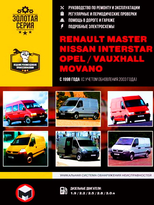 Подробное иллюстрированное справочно-информационное издание Руководство по ремонту Ниссан Интерстар / Renault Master / Opel Movano / Vauxhall Movano, а также руководство по эксплуатации и техническому обслуживанию, устройство Nissan Interstar / Renault Master / Opel Movano / Vauxhall Movano. Эти модели выпускаются с 1998 года, с учетом модификаций 2003 года и оборудуются дизельными двигателями рабочим объемом 1,9, 2,2, 2,5, 2,8, 3,0 л. Ремонт Ниссан Интерстар. Инструкция по эксплуатации. Электросхемы.