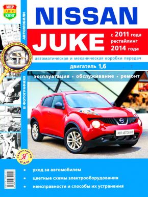 Книга по ремонту Ниссан Жук, руководство по эксплуатации и обслуживанию Nissan Juke с 2011 (учитывая рестайлинг 2014) г. выпуска, оборудованных бензиновыми двигателями рабочим объемом 1,6 литра.