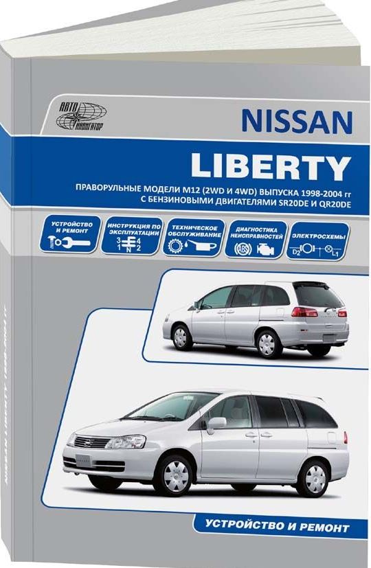 Справочно-информационное издание с иллюстрациями Руководство по ремонту Nissan Liberty, а также руководство по эксплуатации и техническому обслуживанию, устройство праворульных автомобилей Nissan Liberty модели M12 1998-2004 гг. выпуска, оборудованных бензиновыми двигателями SR20DE, рабочим объемом 2,0 л. Ремонт Ниссан Либерти. Устройство. Эксплуатация. ТО. Диагностика неисправностей. Электрические схемы.