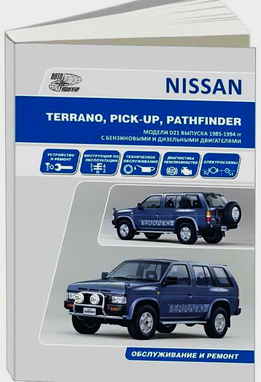 Справочный мануал Руководство по ремонту Nissan Pathfinder / Nissan Terrano I / Nissan Pick-Up, а также устройство, руководство по техническому обслуживанию и эксплуатации автомобилей Nissan Terrano I / Pathfinder / Pick-Up 1985-1994 гг. выпуска, оборудованных бензиновыми двигателями 1,6, 2,0, 2,4, 3,0 л., дизельными двигателями рабочим объемом 2,7 л. и турбодизельными двигателями рабочим объемом 2,7 л. Ремонт узлов и агрегатов Ниссан Патфайндер. Эксплуатация, ТО, устройство, диагностика неисправностей. Схемы электрических соединений.