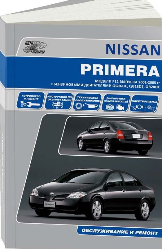 Справочно-информационное пособие автомобилиста Руководство по ремонту Ниссан Примера, руководство по эксплуатации и техническому обслуживанию Nissan Primera, устройство Ниссан Примера с 2001 г. выпуска, оборудованных бензиновыми двигателями QG16DE, QG18DE, QR20DE. Ремонт Ниссан Примера. Пошаговый ремонт узлов и агрегатов. Инструкция по эксплуатации. Рекомендации по ТО, Электросхемы.