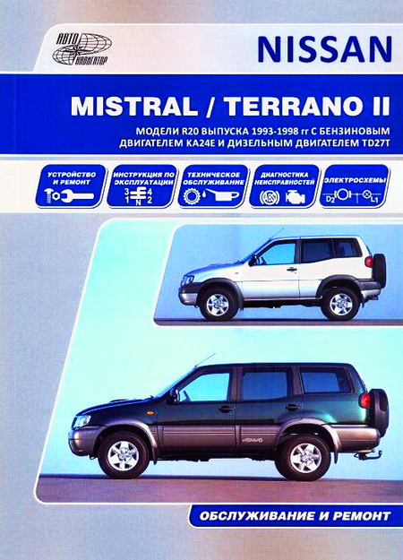 Справочное издание Пособие по ремонту Nissan Terrano II / Ford Maverick, эксплуатация, устройство, техническое обслуживание автомобилей Nissan Terrano II / Ford Maverick с 1993 г. выпуска оборудованных бензиновыми (KA24E) и турбодизельными (TD27T) двигателями. Ремонт Ниссан Террано. Устройство. Техобслуживание. Диагностика. Инструкция по эксплуатации. Электрические схемы.