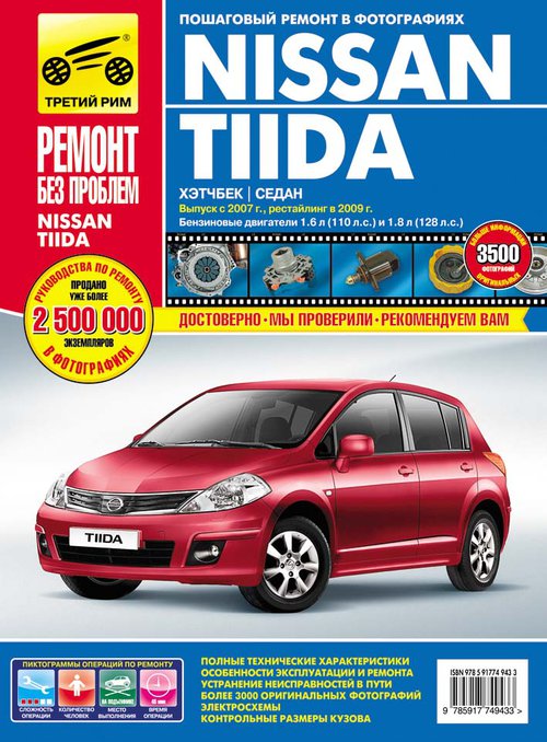 Справочно-информационное пособие с цветными иллюстрациями руководство по ремонту Nissan Tiida, а также руководство по эксплуатации и техническому обслуживанию Nissan Tiida, устройство Nissan Tiida с 2007 г. выпуска (включая рестайлинг 2009), в кузове седан и хетчбек, оборудованных бензиновыми двигателями рабочим объемом 1,6 (110 л.с.) и 1,8 л. (128 л.с.). Пошаговый ремонт в фотографиях. Эксплуатация, обслуживание, электрические схемы Ниссан Тиида.