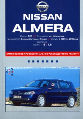 Справочное иллюстрированное издание Пособие по ремонту Ниссан Алмера, а также устройство, руководство по эксплуатации и техническому обслуживанию Ниссан Алмера (тип N16) с передним приводом, которые выпускались концерном Nissan Motor в Сандерленде (Англия) и Киушу (Япония) с 2000 по 2006 годы, оборудовались бензиновыми движками рабочим объемом 1,5 л. (QG15DE – 4-х цилиндровый, 16-ти клапанный) и 1,8 л. (QG18DE – 4-х цилиндровый, 16-ти клапанный), комплектовались 5-ти ступенчатой механической либо 4-х ступенчатой автоматической КП.