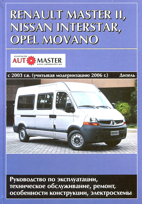 Книга по ремонту Nissan Interstar / Opel Movano / Renault Master II, а также инструкция по эксплуатации и техническому обслуживанию, устройство Ниссан Интерстар, Рено Мастер, Опель Мовано выпускавшихся с 2003 года (с учетом модернизации 2006 года), оборудованных дизельными двигателями. Ремонт узлов и агрегатов. Инструкция по эксплуатации. Схемы электрических соединений.