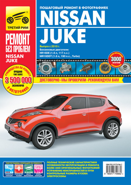 Справочное пособие с уникальными цветными иллюстрациями руководство по ремонту Nissan Juke, а также руководство по эксплуатации Nissan Juke и пособие по техническому обслуживанию Nissan Juke, устройство Ниссан Жук с 2010 г. выпуска, оборудованных бензиновыми моторами HR16DE (117 л.с.) и турбированным MR16DDT (190 л.с.) рабочим объемом 1,6 л. Пошаговый ремонт в цветных фотографиях. Эксплуатация, ТО, электрические схемы.