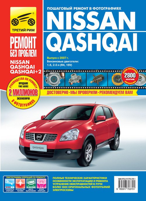 Цветное иллюстрированное справочно-информационное издание Руководство по ремонту Nissan Qashqai, а также руководство по эксплуатации и техническому обслуживанию, подробно рассмотренное устройство Nissan Qashqai с 2007 г. выпуска, оборудованных бензиновыми двигателями рабочим объемом 1,6 и 2,0 л. (R4, 16V).